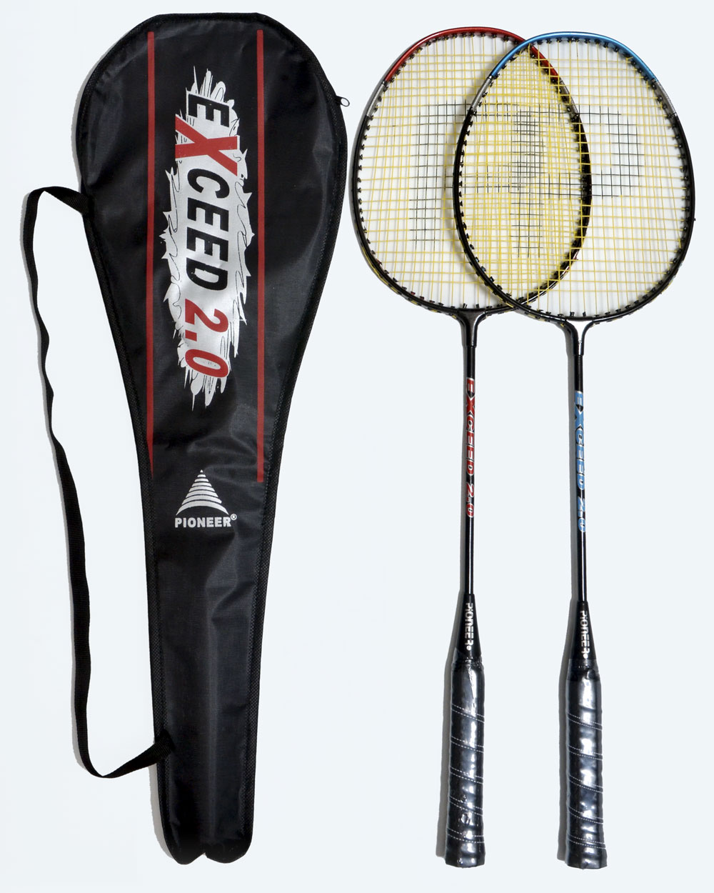 Wide alluminium frame,tempered steel shaft, white strings with logo and header card