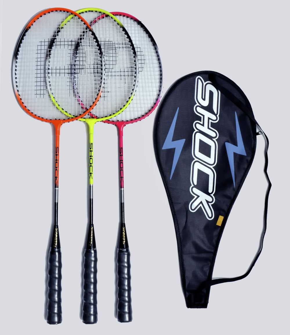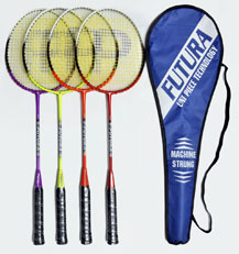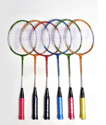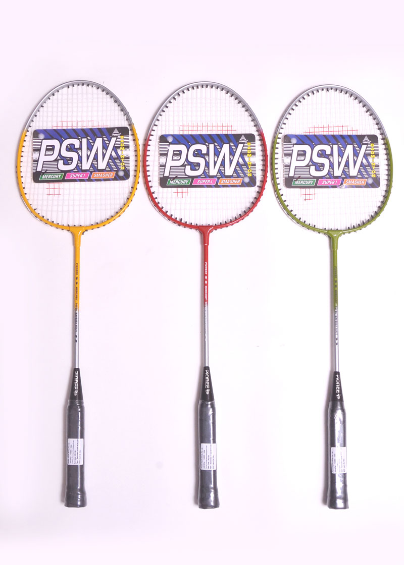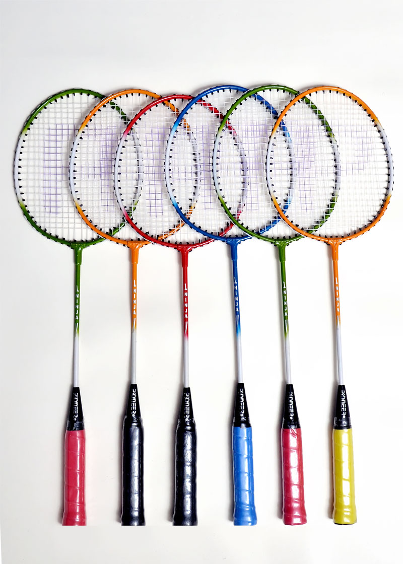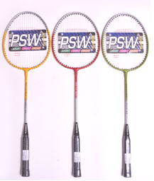 Wide alluminium frame,invisible t joint,Super tempered steel shaft,Finished in assorted colours.Machine strung white,