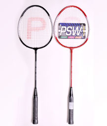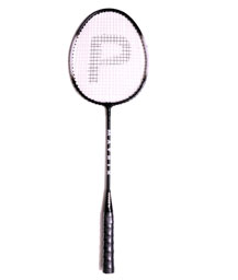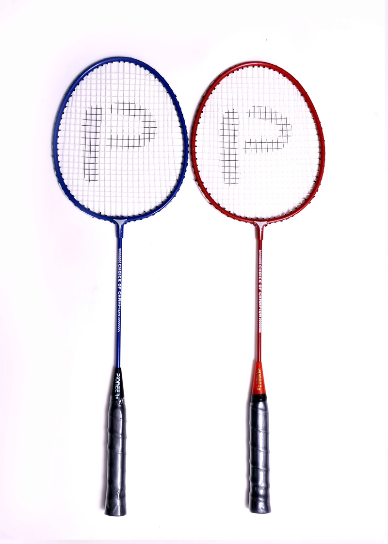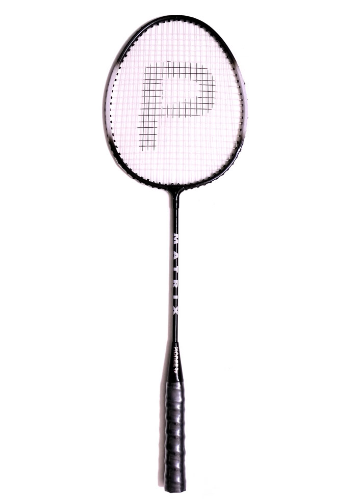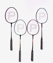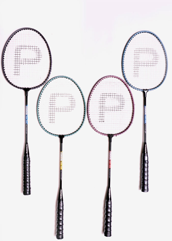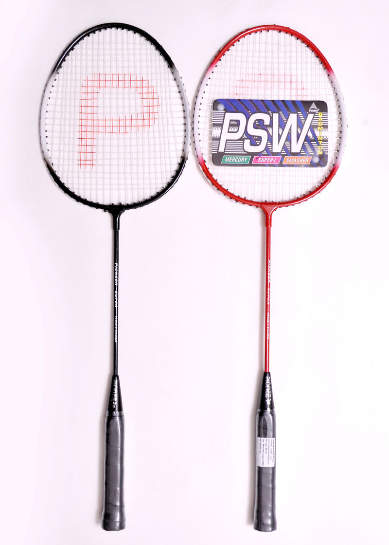 Wide alluminium frame,invisible t joint,Super tempered steel shaft,Finished in assorted colours.Machine strung white,