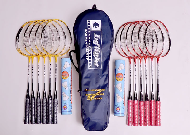 12 Wide body alluminium frame rackets,assorted colours.Machine strung white strings.20 shuttles in 02 boxes.